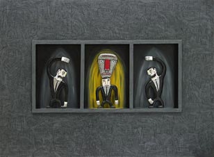 “He is simultaneously Velcro and Teflon. Influences attach themselves to his work like dust particles. Yet he also shakes them off with equal ease, leaving the viewer with the raw visceral impact of his imagery, striking in a place where a laugh and a gasp are indistinguishable.”