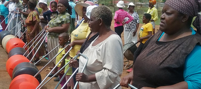 Members of the Borolelo community with barrels of water distributed by Brand South Africa, the Nelson Mandela Foundation and Operation Hydrate in North West on Saturday 12 March.