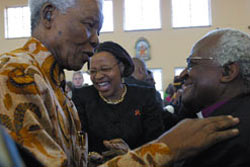 Mandela with Graça Machel, his third wife and the widow of former Mozambican president Samora Machel, and Archbishop Desmond Tutu at a celebration of Tutu and his wife Leah’s 50th wedding anniversary (Image: Hope Foundation)Nelson Mandela had the freedom of 45 cities around the world, and honorary citizenship of 11. In Johannesburg, his image is cast in a 6m high bronze statue and stands preserved in his famous jive in Nelson Mandela Square.
