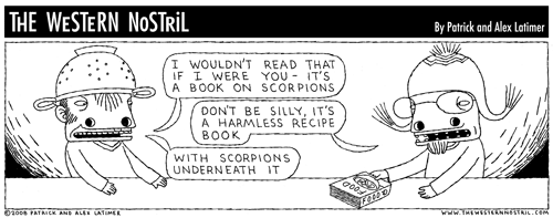 When creating The Western Nostril, Patrick and Alex brainstorm ideas separately, then put them together to see which ideas are good and which are bad. “Alex takes the good ones and writes them into a script that works best, doing re-writes where necessary”, says older brother, Patrick. “And I do all the drawing.”