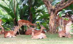 There are over 40 types of African animals that visitors can see at this Safari, including giraffe, white rhino, sable antelope, buffalo, nyala, gemsbok (oryx), kudu, Livingstone eland, blue wildebeest (gnu), red hartebeest, zebra, impala, bushbuck, duiker, steenbok, mountain reedbuck, waterbuck, warthog, blesbok, baboon, bushpig, klipspringers, leopard, jackal, brown hyena, caracal, civet and genet – to name a few.