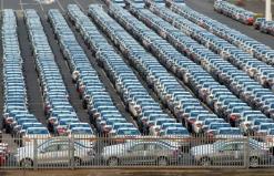 New Mercedes-Benz cars await export on