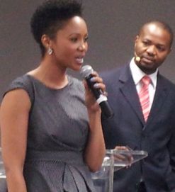 Given Mkhari (right), the station’s chairman, introduces Azania Mosaka, one of the talk show hosts.