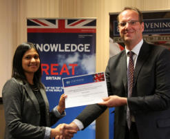Beverly Singh receives her Bloodhound SSC Chevening Scholarship from the UK’s deputy high commissioner in South Africa, Martin Reynolds.