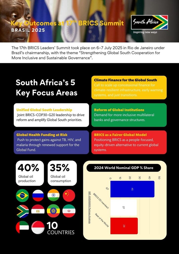 South Africa’s active participation in the 17th BRICS Summit reinforced its diplomatic and economic positioning within the Global South. The summit not only affirmed BRICS’ growing geopolitical relevance – now representing nearly half of the global population and over a third of world GDP – but also strengthened South Africa’s role as a mediator between emerging powers and global institutions.