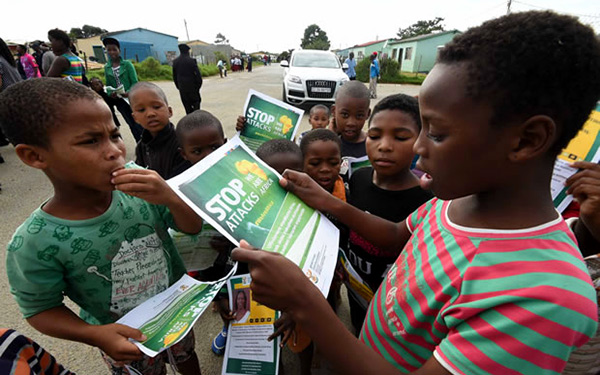 Children read anti-xenophobia booklets during a peaceful walk against attacks on foreigners, in Mzamomhle Township near East London in the Eastern Cape on Sunday 26 April.