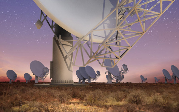 An artist’s impression of the MeerKAT array telescope, the major part of the Square Kilometre Array to be built in South Africa’s Karoo desert. The MeerKAT is expected to be science-ready by the end of 2017. Click for a larger view. (Image: SKA South Africa)