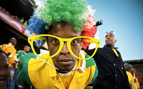 A familiar sight in stadiums is fans wearing a makarapa, a modified and elaborately decorated plastic miners’ helmet. Anything goes on a makarapa: the colours of the supporter’s team, goat horns, bells, bicycle horns …