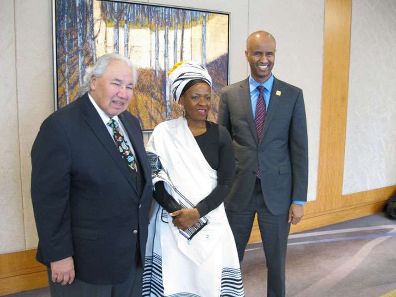 Mpho Tutu van Furth, daughter of Desmond Tutu, centre, with Senator Murray Sinclair, left, and Immigration Minister Ahmed Hussen at the University of the West Indies annual benefit gala in Toronto on 1 April 2017. Van Furth accepted the Luminary Award on her father’s behalf. (Image: Nicholas Keung, via UWI Gala)