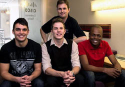 NMMU-cisco-students-250Ryno Schoeman, Pieter Delport and Wonga Vika with NMMU lecturer Shaun Vincent (Image: Cisco)The annual Cisco NetRiders competition tests the skills of Cisco networking students from around the world in a challenge that progresses from country level, to a global level. Students compete individually, and three top scores per participating country move on to participate in the regional NetRiders competition.