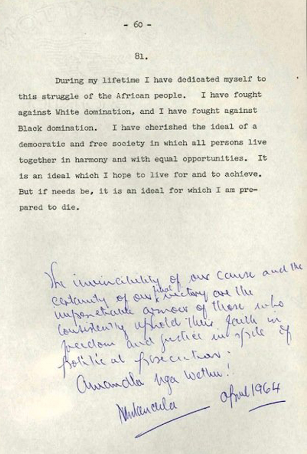 The Nelson Mandela Centre of Memory has a rare typescript of the speech, delivered on 20 April 1964, which Mandela autographed and gave to a comrade as a gift.